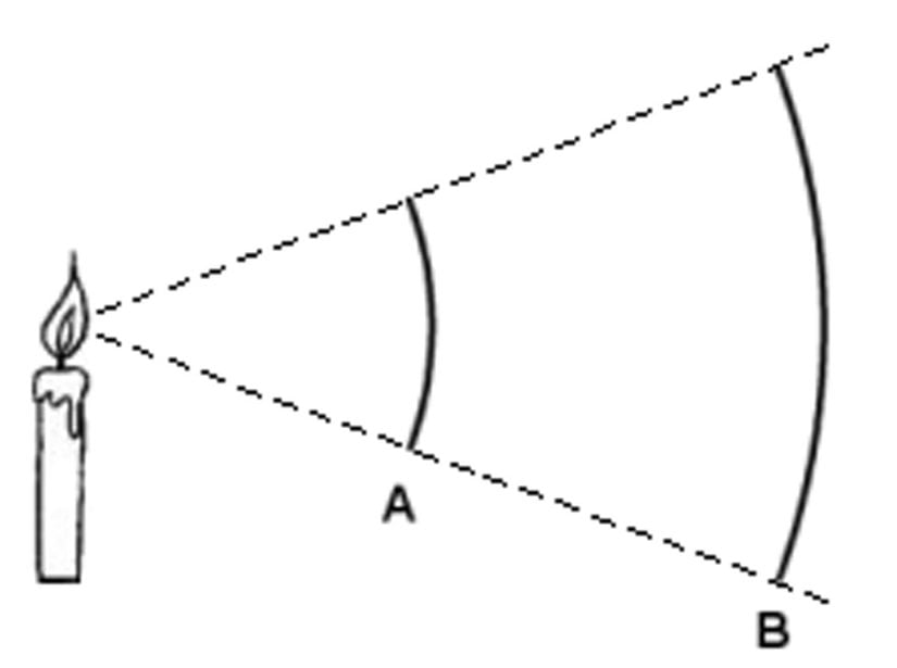 Kandela, aslında "candle" (Tür: "mum") sözcüğünden türemiştir. SI birim sisteminde, üç boyutlu açı boyunca saçılan ışık miktarını ifade eder. Işıma yeğinliği tanımı gereği bu açısal dağılımı içerdiğinden, mesafeye bağlı değildir. Yani yandaki iki boyuta indirgenmiş görselde A yüzeyi ile B yüzeyi aynı ışık miktarını elde eder. Lakin anlayacağınız üzere aynı ışık miktarı B yüzeyinde daha geniş bir alana yayıldığından, birim alana düşen ışık miktarı B'de azalır (lüks değeri düşer).