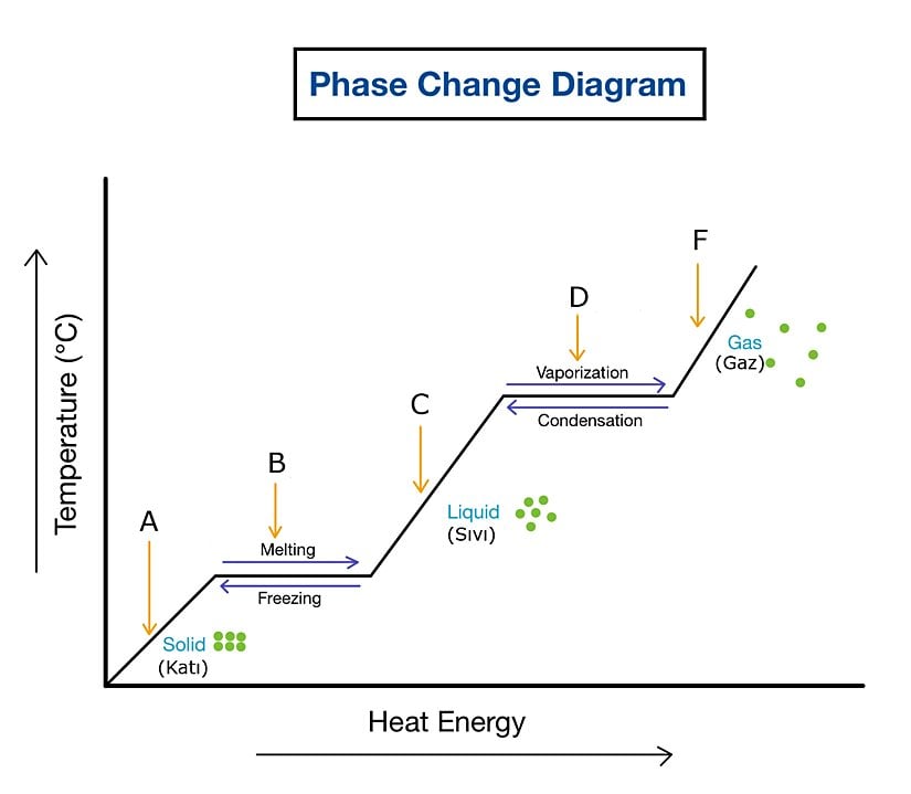 - Madde hal değişimi yolculuğuna A noktasında, katı halde başlıyor. Isı alan maddenin sıcaklığı artıyor. Ancak A noktasında herhangi bir faz değişimi yaşanmıyor.