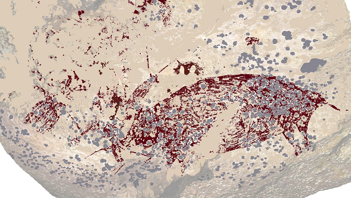 Yeni tarihlendirilen resim, Endonezya'nın Sulawesi adasındaki Leang Karampuang adlı bir kireçtaşı oyuğunun içinde yer alıyor. Resim, muhtemelen bir Sulawesi siğilli domuzunu ve etrafındaki insan veya insan-hayvan melezi figürleri tasvir ediyor. Makalenin ortak yazarı olan Griffith Üniversitesi'nden arkeolog Adam Brumm, binlerce yıl boyunca atmosferik koşulların mağara resimlerinde onun "patlamış mağara mısırı" dediği beyazımsı kalsiyum karbonat parçaları oluşturduğunu söylüyor.