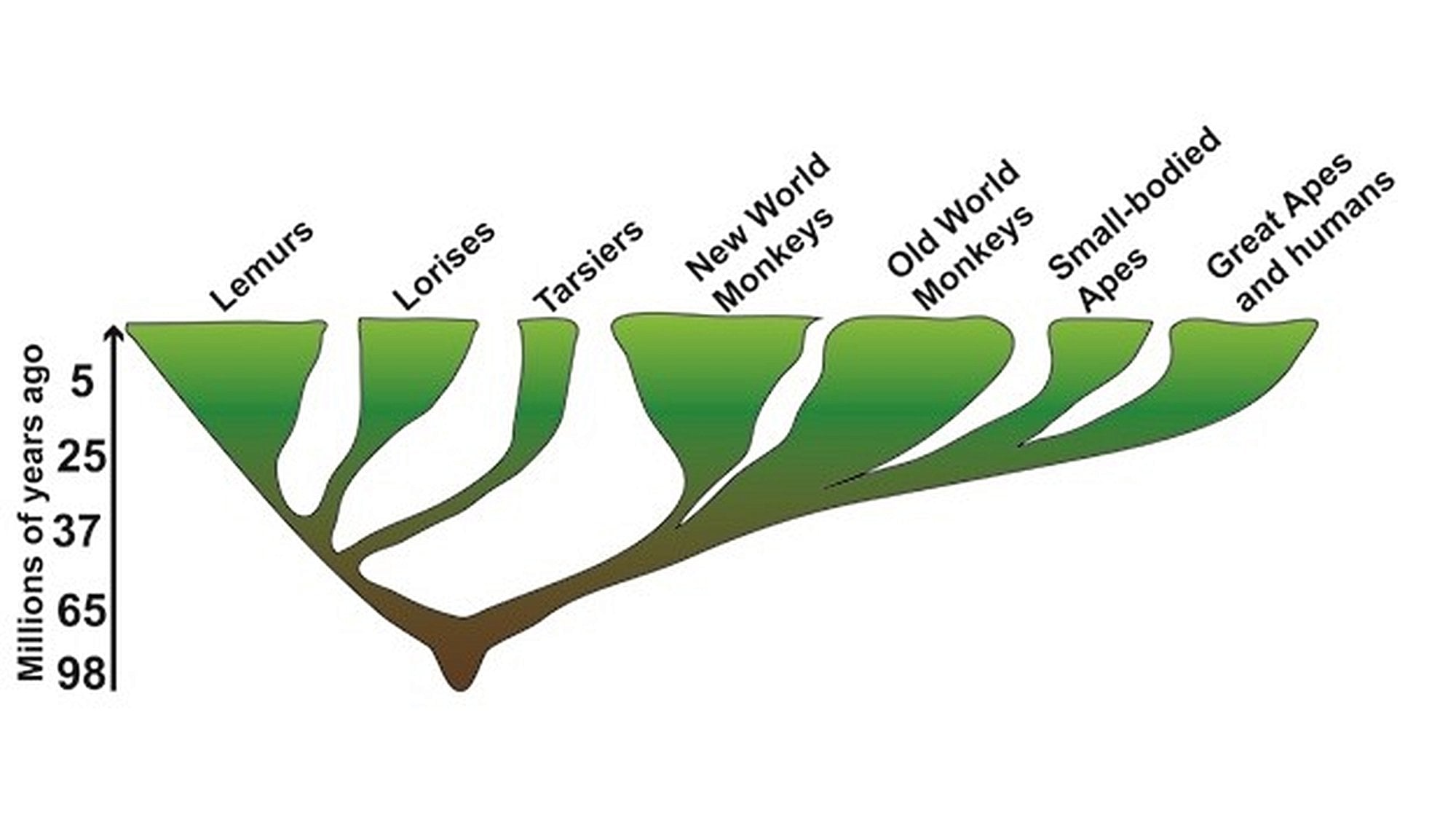 Yakın zamandaki çalışmalar, birçok mevcut primat soy hattının genomlarından toplanan genetik verilerle oluşturulan filogenetik ağaçları kullanarak primat evriminin temposu ve modu hakkında yeni bilgiler sağlamıştır (Fabre ve ark. 2009, Perelman ve ark. 2011). Bu çalışmalar, primatlar arasındaki evrim tempo ve modunun eski kalıntı soy hatlarının kalıcılığı (yani durağanlığı), adaptif radyasyonla tutarlı olabilen türleşme patlamaları ve hatta mikroevrimsel süreçlerle yönetilmekte olan ve hala devam eden türleşme tarafından kesintilere uğradığını ortaya çıkarmıştır. Perelman ve ark. (2011) yakın zamanda 61 primat cinsi için bir primat genetik filogenetik ağacı inşa etmiştir (Görsel 2). Tarsiyerleri diğer primatlardan ayıran uzun dal, bu grubun diğer primatlara göre durağanlıkta kalan eski kalıntı bir soy hattı olduğunu ileri sürmektedir. Buna karşılık, ağacın Lemursular (Lemuriformes: lemur-benzeri ıslak burunlular) kısmı, ilk dönemlerindeki çok sayıda kısa dalı takip eden bazı uzun dallara sahiptir (bkz. Görsel 1). Bu da bize mevcut lemurların atalarının yaklaşık 62-65 milyon yıl önce büyük ihtimalle Madagaskar’ın kolonileşmesiyle çakışan hızlı bir adaptif radyasyon yaşadığını göstermektedir (Perelman ve ark. 2011).