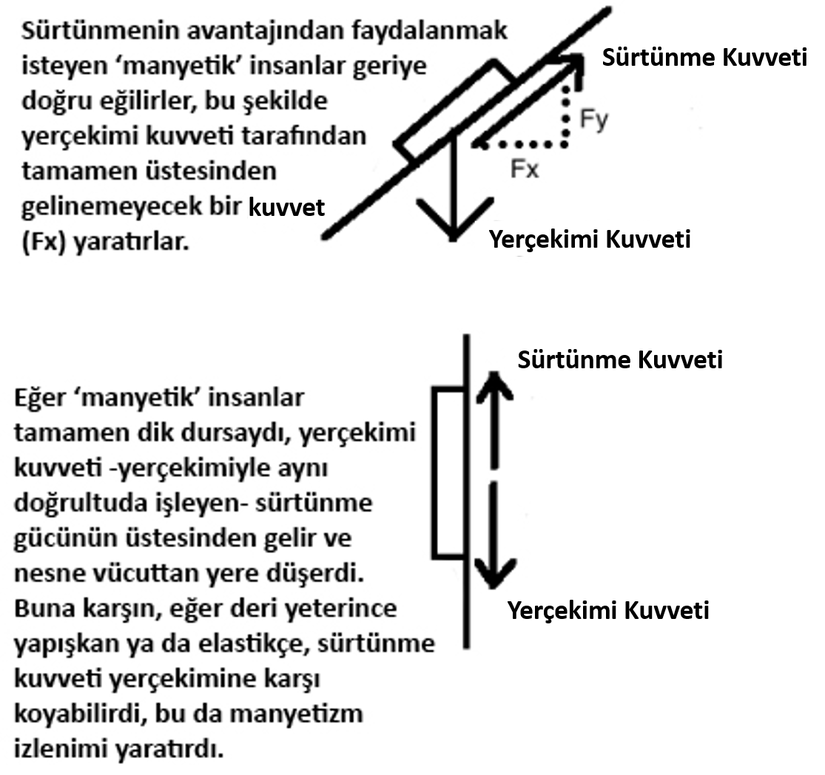 Ama tabii ki tüm bu gösteri sadece sürtünmeye dayanıyor olsaydı, bunu siz bile yapabilirdiniz. İşte bu 'manyetik' insanların özel nitelikleri burada devreye girer. 'Manyetik' insanların sıradışı yapışkanlıkta yapışkan (veya nemli) ve elastik bir tenleri vardır. Bu yapışkanlık, sebum adı verilen doğal bir salgıdan kaynaklanmaktadır. Şüphecinin Sözlüğüne (Skeptic's Dictionary) göre: