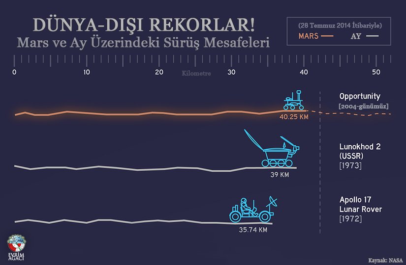 - NASA'nın Opportunity uzay aracı, Mars'ta 40 kilometreden fazla mesafe kat ederek dünya dışı keşiflerde tekerlekli araçlar arasında rekor kırmıştır.