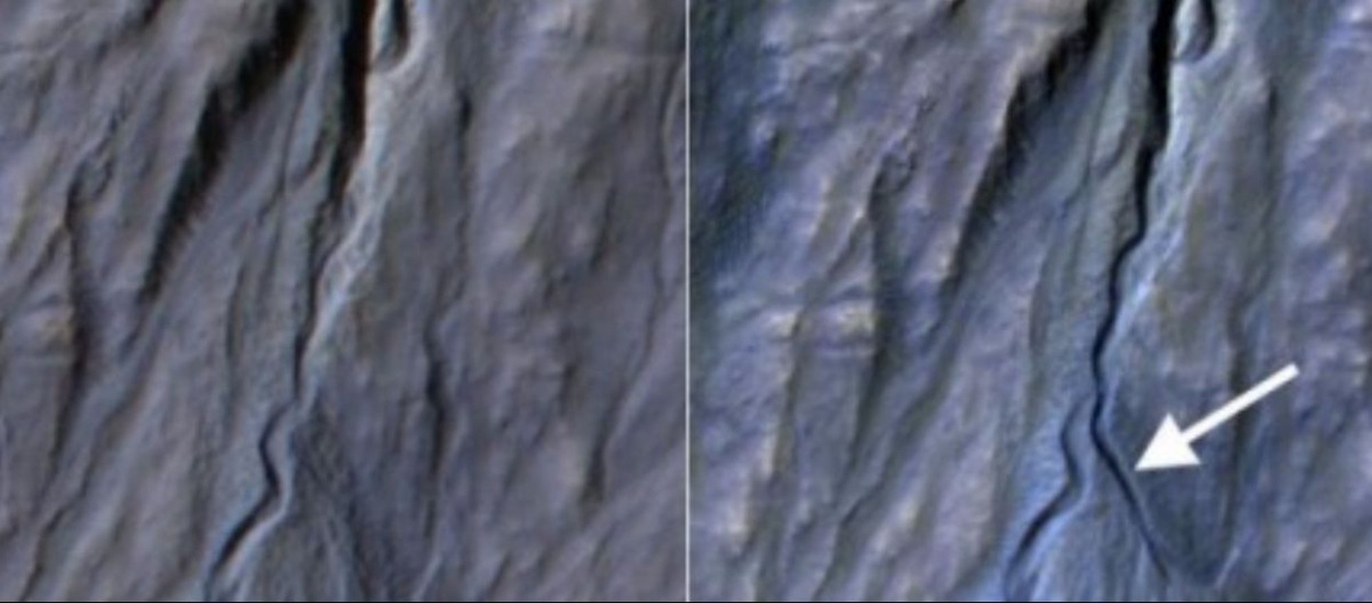 Fotoğrafta, sol tarafta Mars'ın Kasım 2010'daki, sağ tarafta ise Mayıs 2013'teki fotoğraflarını görüyorsunuz. Ok ile gösterilen kısım, daha önceden yokken, sonradan oluşan bir yapı. Peki bu nedir?