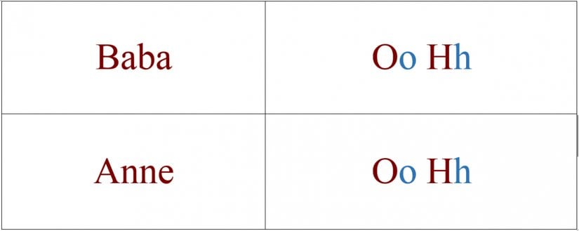 Sperm ve yumurta tekrarlarının çıkarıldığı basitleştirilmiş tablo aşağıda verilmiştir (örneğin "oh" kombinasyonunu 2 defa yazmanın anlamı yok):