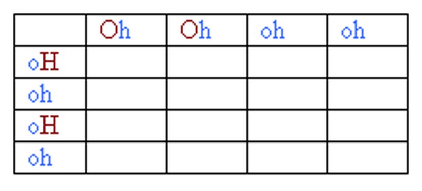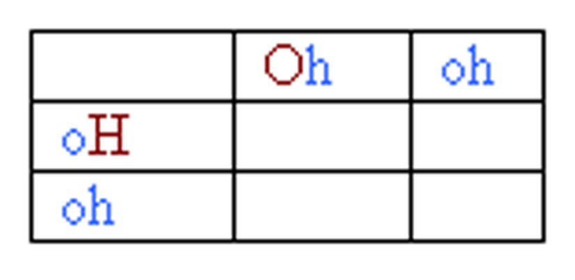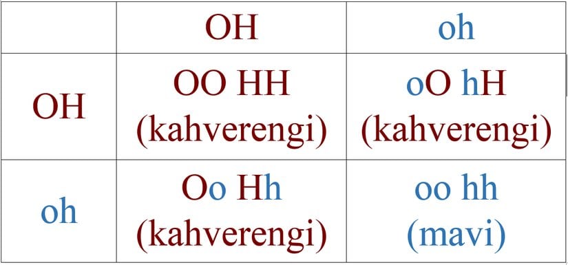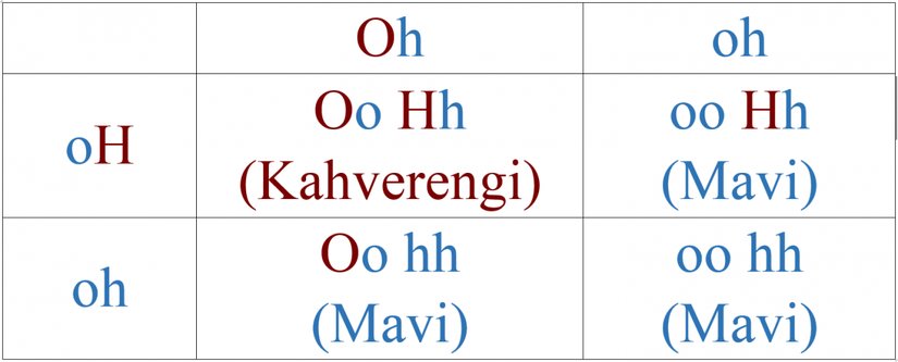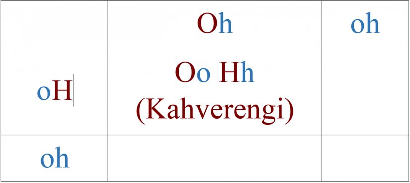 Bir sonraki adım, karelere olası genetik kombinasyonları yazmaktır. Bunun için tek yapacağımız, her bir boş kareye üstte ve solda denk gelen gen kombinasyonlarını yazmaktır. Sonrasındaysa, elde ettiğimiz bu kombinasyonun ilk 2 tabloda verdiğimiz 9 kombinasyondan hangisine denk geldiğini (kahverengi mi, mavi mi) yazabiliriz. Örneğin, ilk karede yukarıdan "Oh", soldan "oH" gelmektedir ve kombinasyon "Oh oH" olmaktadır. Bu da, tablomuzda "kahverengi gözlü" bir çocuğa denk gelir. Gösterelim: