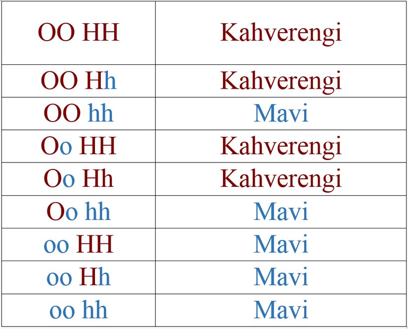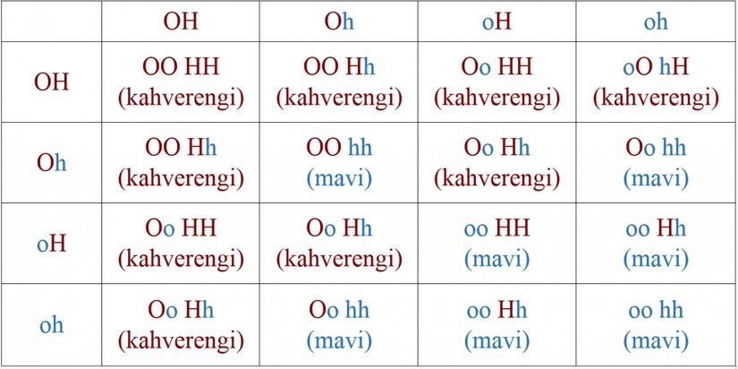 Diğer yandan sağ alt köşedeki olasılığın, artık kahverengiye neden olan hiçbir geni (veya aleli) taşımadığına dikkat ediniz! O çocuğun kahverengi gözlü bir çocuğa sahip olması, anne babasınınki kadar kolay olmayacaktır!