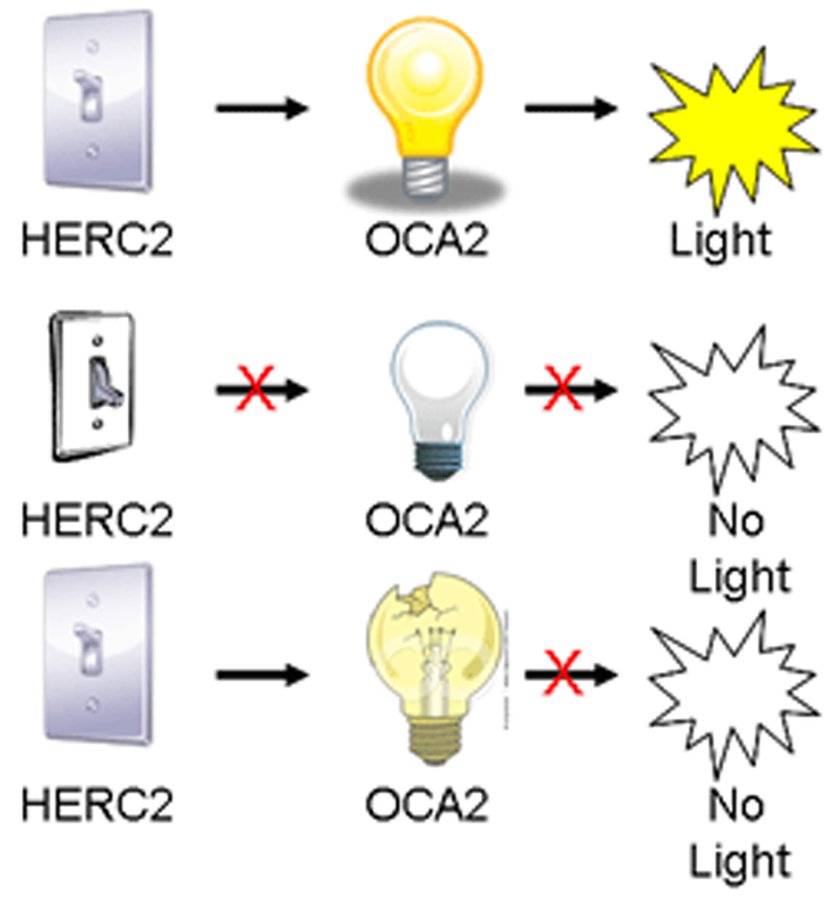 Bunu biraz daha temel düzeyde izah edelim: OCA2’yi bir ampul, HERC2’yi de bir elektrik anahtarı gibi düşününüz. Ampul bozuksa anahtarın hangi konumda olduğunun bir önemi yoktur. Her halükarda çalışmaz. Aynen OCA2’si çalışmayan kişide HERC2’nin çalışmasının bir önemi olmadığı gibi. Bozuk bir ampulün anahtarını açık konuma almak, ışık saçamayacaktır! Aynı şey çalışan bir OCA2 ve çalışmayan bir HERC2 için de doğrudur. Çalışan bir ampul, anahtarı kapalı olduğunda ışık saçamaz. Çalışan OCA2 de, HERC2 geni çalışmadığında pigment üretmez.