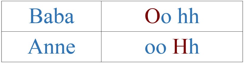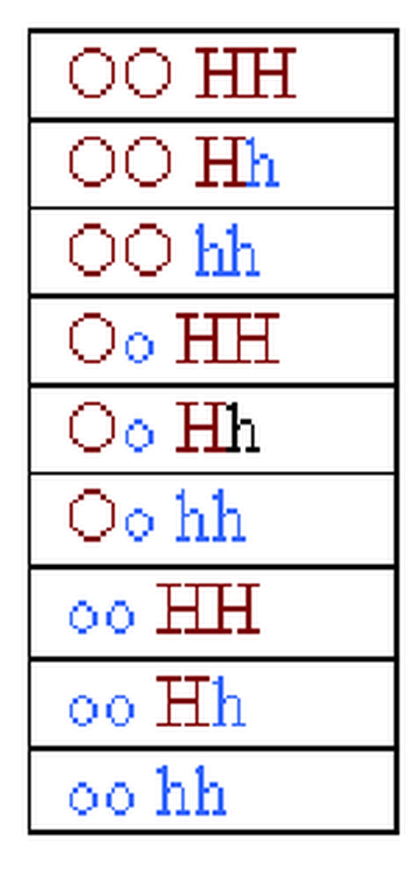 Bazı kombinasyonlar, asla öteki renge sahip çocukları doğuramaz. Örneğin, "oo HH" ve "OO hh" kombinasyonlarını taşıyan anne babaların Punnett karesi şöyle görünür: