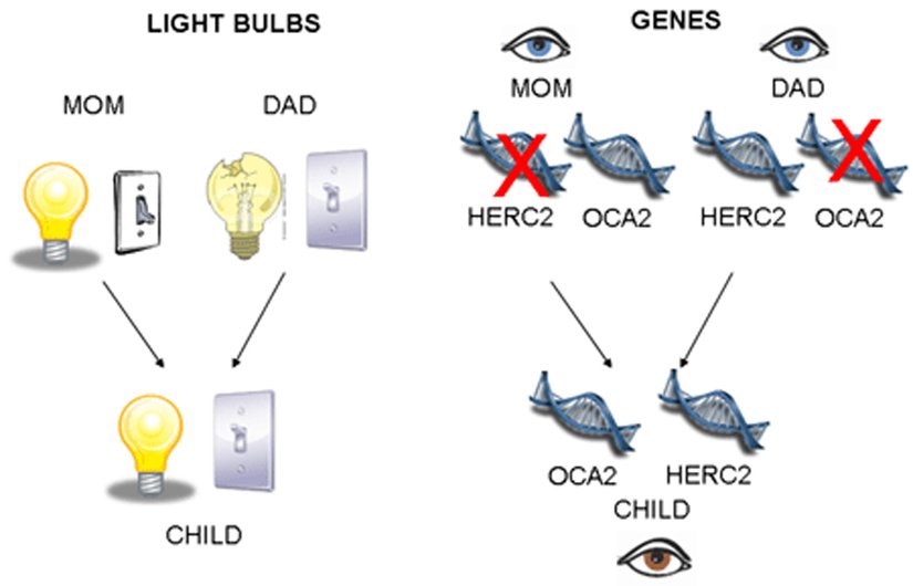 Bu iki kişi, çocuk sahibi olduğunda biri açık anahtarı, diğeri de çalışan ampulü aktarabilir. Anne babanın ikisi de daha önce ışık üretemediği halde çocukta ışık yanacaktır. Genetik terimlerle söylersek, anne babadan biri çalışan bir HERC2, diğeri de çalışan bir OCA2 aktarabilir. Daha önce ebeveynlerde hiç olmadığı halde, yavruda artık pigment vardır! Sonuç: kahverengi gözlü bir çocuk! Bu ampul/anahtar ilişkisi, genetik biliminde epistazi olarak adlandırılır. Bu, bir genin başka bir gene bağlı olduğunu söylemenin sadece süslü bir şeklidir. Ve biri bozulursa artık ikisinin de bir etkisi olmayacaktır.