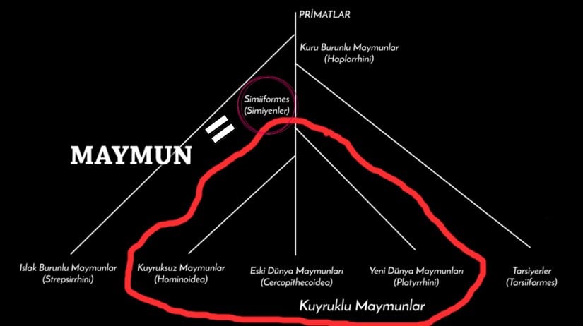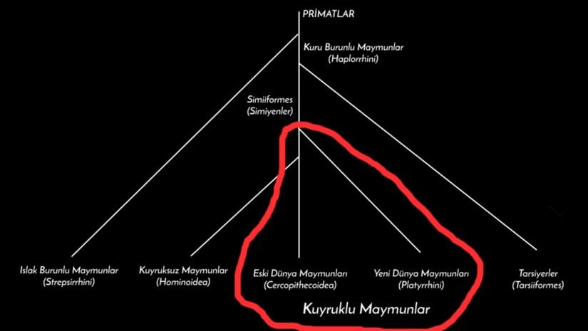 Biz, Evrim Ağacı olarak bu tanımı kullanıyoruz. Simiyenler, ya da maymunlar, kuyruklu maymunlar ve kuyruksuz maymunlar olarak ikiye ayrılıyor. Biz insanlar, bu ayrımın Kuyruksuz Maymun olan tarafındayız. Hepsi bu. Bu konularda çok daha fazla bilgiyi buradan alabilirsiniz.