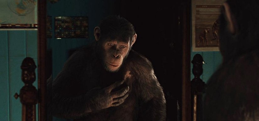 Sezar'ın kendi kendini bir hayvan olarak değil bir "birey" olarak kabul ettiği böylece kendi benliğinin farkına vardığı anlardan biri, Rise of the Planet of the Apes'te arabanın bagajına binmek yerine kendi tercihiyle koltuğa binmeyi seçtiği sahneydi. Koltuğa binme tercihi, kendi kimliğini ve toplum içindeki yerini bulma sürecinin başlangıcı olacaktı.