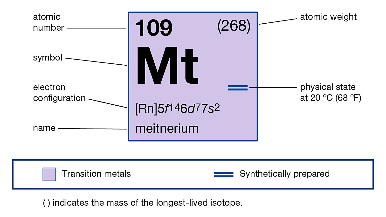 - Şu anda sadece bilimsel araştırmalarda kullanılan meitneriyum, periyodik tablonun 7. periyodunda, 9. grupta yer alır ve kobalt, rodyum ile iridyuma benzer kimyasal özelliklere sahip olduğu tahmin edilmektedir.