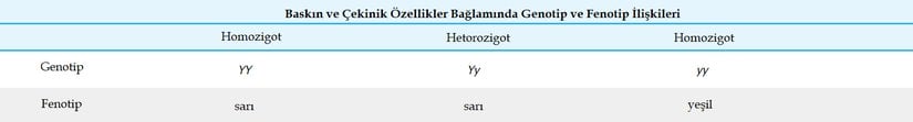 Baskın ve çekinik (Yy) şeklinde ifade edilen genler, homozigot baskın ve hetorozigot organizmalarda genotip bağlamında farklara sahip olmalarına karşın fenotipik açıdan aynı özelliği sergilerler. Çekinik aleller ise yalnızca homozigot çekinik bireylerde gözlemlenir.