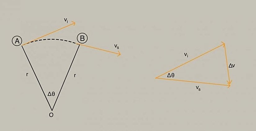 olduğunu bulmuş oluruz. Bu ifade düzgün dairesel hareket yapan bir cisim için merkezcil ivme formülüdür. Burada görsele geri dönüp odaklanmanız gerekmektedir. Eğer A\text{A} ve B\text{B} birbirine çok yakın olurlarsa, ΔvΔv vektörünün yönünün nereye baktığını anlamaya çalışın. Bu hiç kuşkusuz ivmemizin doğrultusudur ve merkeze doğrudur.