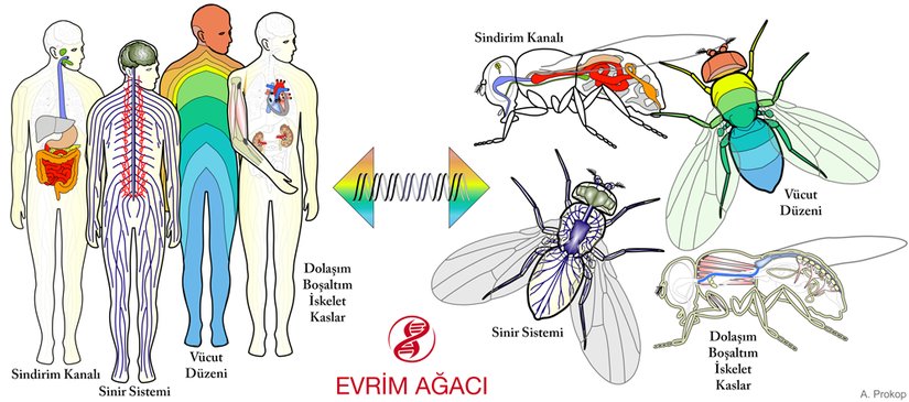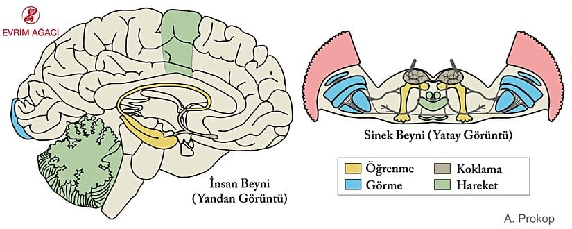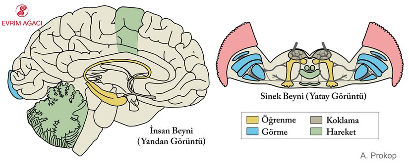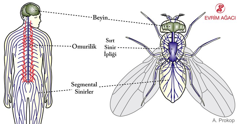 Gerçekten de evrimsel bakış açısıyla Drosophila beyni ile insan beyni arasındaki homoloji (benzeşiklik) gösterildi [62]. Gelişimsel ve genetik verilere dayanarak Reichert ve ark. ile Hirth, Drosophila’nın protoserebrum, dutoserebrum ve tritoserebrum bölümlerinin omurgalılarda, sırasıyla ön beyin, orta beyin ve arka beyin bölümleriyle homolog (analog değil!) olduğunu ileri sürdüler [63], [64]. Bu yazının önceki bölümlerinde bahsedilmiş olduğu gibi, kısımlaşmadan sorumlu benzer genler ve onların ürünlerinin varlığı bir kez daha karşımıza çıkmaktadır. Örneğin, Inoue ve ark.nın göstermiş olduğu üzere, Otx2 ve Gbx2 gibi genler omurgalılarda orta beyin ve arka beyin arasındaki, sineklerde ise dutoserebrum ve tritoserebrum arasındaki sınırı belirliyor [65]. Dahası, basit rol değişimleri evrimci gelişimsel değişimler hakkında ilginç bilgiler verebilir. Örneğin, Püschel ve ark.nın 1992’de gösterdiği gibi, Pax2/5/8 geni Drosophila melanogaster’in posterior dutoserebrum bölgesinde oldukça fazla transkribe edilmiş bir gen iken, aynı gen orta beyin-arka beyin sınırında da fazlasıyla transkribedir [66].