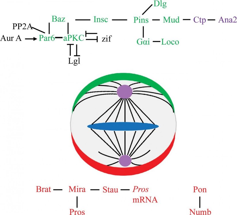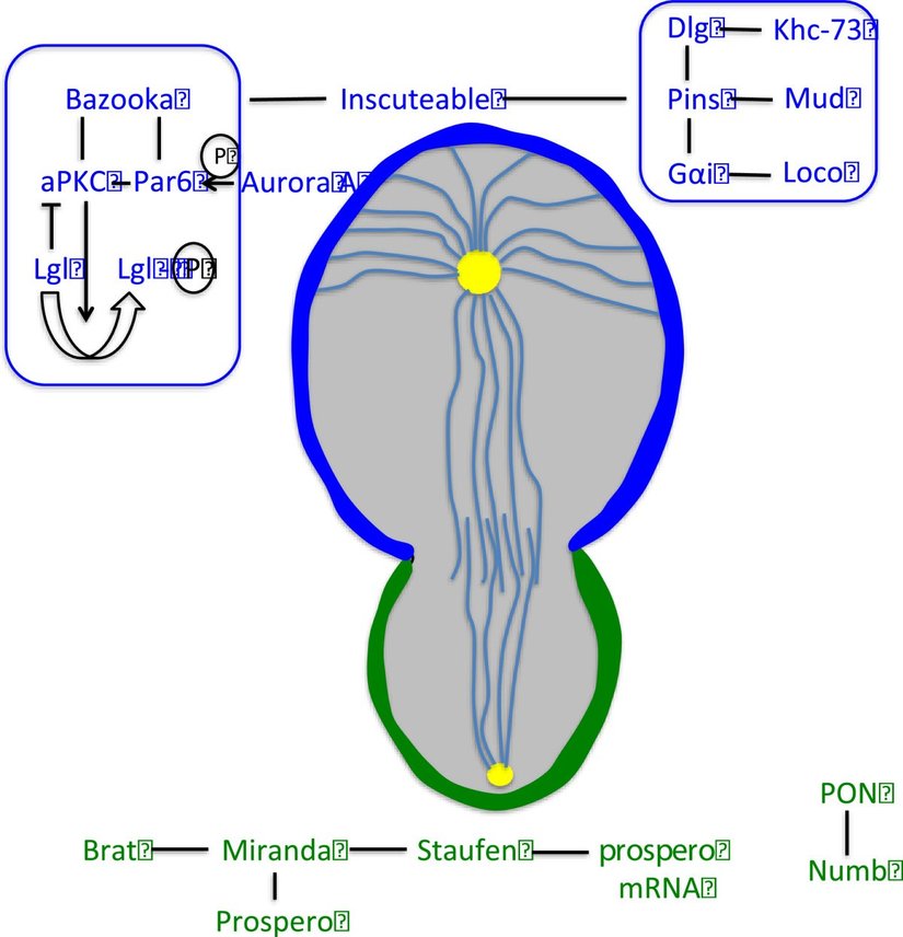 Prospero, Miranda ve Numb kutuplaşmasının ve onların hücre iskeleti üzerindeki etkilerinin sonucu olarak, mitoz bölünmeyle oluşan yavru hücreler bu iki genin protein ürünlerinden farklı miktarlarda alırlar, yani bir hücre bu proteinlerden çokça alırken diğeri neredeyse hiç protein alamaz. Sonrasında da, mitoz hücre bölünmesinin görünürde aynı olan ürünleri hücre farklılaşmasına yol açan temel bir farklılığa sahip olurlar [18]. Açıkça görülüyor ki bu proteinler arasındaki etkileşimi ve hücredeki iğcikleri (ve biçimlerini) anlamak, yolağın tam olarak nasıl işlediğine ışık tutmak için çok önemlidir. Yu ve ark. literatürü inceleyerek Inscuteable ve hücredeki mikrotübüller arasındaki etkileşimi gösteren bazı çalışmaları tespit etmeyi başardılar [19]. Bu çalışmalarda, mikrotübüllerin Inscuteable genine farklı bir bağımlılığı olduğu ele alınıyor, hem yukarıda bahsedilen proteinlerin asimetrik toplanmaları hem de heterotrimerik G gibi bazı başka proteinlerle mikrotübüllerin özellikleri arasında doğrudan bir ilişki olduğu gösteriliyordu.