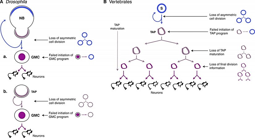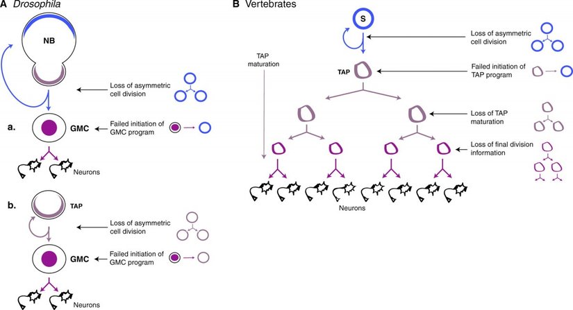 Drosophila’nın sinir kök hücreleri (veya “nöroblast”ları) nöroektodermden ayrılır ve bir dizi asimetrik hücre bölünmesine uğrar [11]. Hatta nöroblastların sayısı bile izlenebilir. Ektodermin nörojenik kısmından katmanlar halinde ayrılan yaklaşık 100 nöroblast olduğu, bunun 25 kadarının da ikincil öncül sinir hücresine dönüştüğü doğrulanmıştır [12], [13]. Bu hücrelerin her biri nöroblastları yeniler, bu arada bir taraftan da bir grup sinir öncül hücresi oluşturur. Bu öncül hücrelere bazen Gangliyon Ana Hücresi (GAH) denir. Bu hücrelerin kaderi, nöroblastlarınkinin tamamen tersidir. Tek bir GAH mitoz bölünmenin yavru hücreleri, hücre döngüsünü devam ettirmez ve farklılaşmaya başlarlar [14]. İlgili bazı anahtar genlerin ismini alan Prospero ve Miranda gibi yolakları kapsayan bu süreç boyunca, nöroblastların sadece bazıları bu aracı hücreleri üretirlerken çoğu nöroblast proliferatif bölünmenin asimetrik moduna döner. Nöroblastlar, böylece yetişkine-özgü ikincil nöronlardan soy hattına ait diğer öbekleri oluşturabilirler. ) Drosophila beyninde farklı nöronların nasıl üretilebildiğinin arkasındaki temel fikir budur [15].