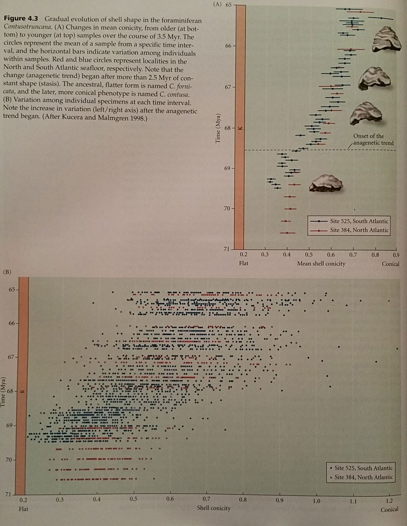 Fotoğrafın sağ üst köşesinde gördüğünüz, 3.5 milyon yıllık bir süre zarfında bu canlıların kabuklarının konilik miktarının kademeli değişimidir. Grafikte zaman, aşağıdan yukarı doğru akmaktadır ve günümüzden 71-61 milyon yıl öncesini göstermektedir. Biri Kuzey Atlantik okyanus tabanı (mavi noktalar), diğeri Güney Atlantik okyanus tabanı (kırmızı noktalar) olmak üzere 2 ayrı coğrafyada yaşamış canlılardan örnekler toplanmıştır. Grafikteki her bir nokta, o zaman diliminde bu canlıların popülasyonundaki kabuk konilik miktarının ortalamasını göstermektedir. Örneğin günümüzden 70.7 milyon yıl kadar önce bu değer Güney Afrika popülasyonu için 0.4 civarındayken, günümüzden 65.1 milyon yıl önce aynı değer 0.72 dolaylarına kadar yükselmiştir. Benzer bir durumu, Kuzey Amerika popülasyonunda da görmekteyiz: günümüzden 69.4 milyon yıl kadar önce ortalama kabuk konikliği 0.32 dolaylarındayken, günümüzden 65.3 milyon yıl kadar önce bu değer 0.7 dolaylarındadır! İki durumda da ortalamada 2 katlık bir artışı görmekteyiz.