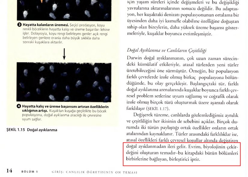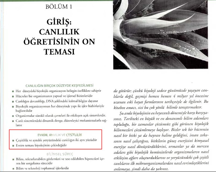 Campbell, Biyoloji (12. Baskıdan Çeviri)Biyolojiye girişin 1 numaralı ders kitabında verilen temalar arasında evrim, biyolojinin "çekirdeği" olarak tanımlanmaktadır ve diğer bütün bölümleri ve temaları birbirine bağlayan ip olarak aktarılmaktadır. MEB'in seçtiği 8 temadaysa biyolojinin en önemli ve merkezi teması olan evrimin adı bile geçirilmemektedir. Böyle bir biyoloji eğitimi nasıl modern olabilir? Nasıl mümkün olabilir?