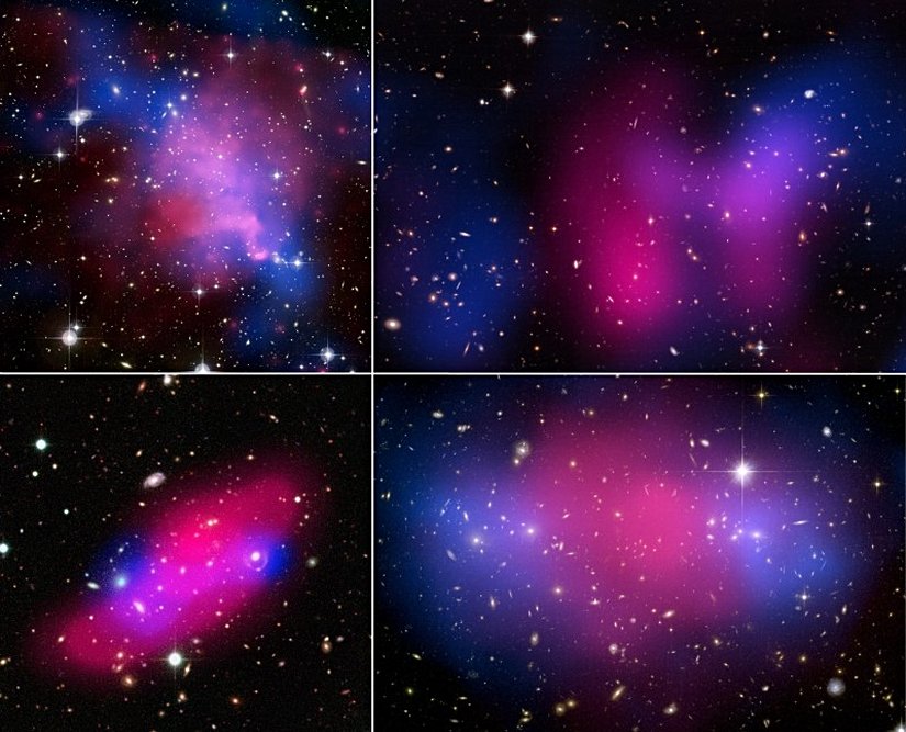 Ve olağanüstü bir şekilde, elinizde çarpışan gökadalara ilişkin tamamen yeni bir tahmininiz de olabiliyor: İki gökada çarpıştıklarında, içerideki gaz ısınmalı ve yavaşlayarak X-ışınları salmalı (resimdeki pembe bölgeler), bu sırada da çekimsel mercek etkisi ile görmeyi başarabildiğimiz kütle (resimde mavi bölgeler), karanlık maddeyi takip etmeli ve X-ışınlarından ayrılmalı. Gözlemsel sonuçlardan doğan bu yeni teori, son on yılda ortaya çıktı ve karanlık maddenin varlığına ilişkin doğrudan olmayan en önemli kanıtlardan biri olarak görüldü.