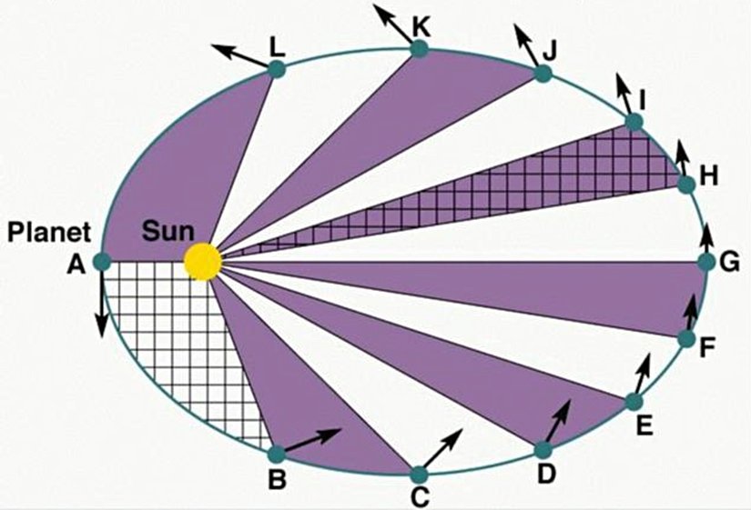 - Güneş etrafındaki yörüngesinde, her bir gezegen tarafından süpürülen alan, her bir zaman aralığında, yörüngenin her noktasında birbirine eşittir. Yani bbir gezegenin yörüngesinde eşit zaman aralıklarında süpürdüğü alanlar birbirlerine eşittir: Gezegen, Güneş'e yakınken hızlı hareket ederek daha geniş bir kesitte alan süpürürken, uzakken daha dar fakat daha uzun bir kesitte alan süpürür. Bu iki alan eşit zaman aralıklarında birbirlerine eşittir.