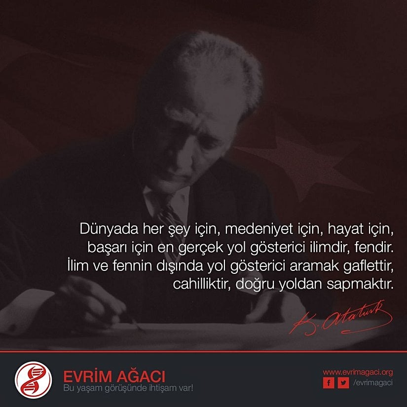 Atatürk'ün görsele yazdığımız sözlerindeki sözcük seçimleri de çok özel bir anlam taşımaktadır. Atatürk, hayattaki her şey için tek yol göstericinin "ilim" ve "fen" olduğunu belirtmektedir. İlim, TDK tarafından basitçe "bilim" olarak tanımlanmaktadır; yani "ilim" ile "bilim" sözcükleri arasında hiçbir fark yoktur. Kökeni Kutadgu Bilig'e kadar takip edilebilecek olan "ilim" sözcüğü, Arapçada "bilgi, özellikle teorik bilgi ve bilim" olarak tanımlanmaktadır. Yani Atatürk, gerçek ve saf bilginin kaynağını doğru olarak saptamaktadır: Bilim!