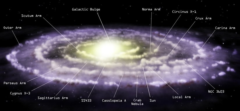 Harvard ÜniversitesiSamanyolu Galaksisi içerisinde 300 milyar civarında yıldız vardır! Güneş'in etrafında olduğu gibi, bunların birçoğunun etrafında potansiyel bir dolu gezegen vardır. Ve siz, yukarıda "Sun" olarak işaretlenmiş ufacık bir nokta içerisindesiniz. Ve o nokta, Güneş'i ve az önce gördüğümüz tüm gezegenleri barındırıyor. Galaksimizin ne kadar devasa olduğunu daha iyi anlatabiliriz: