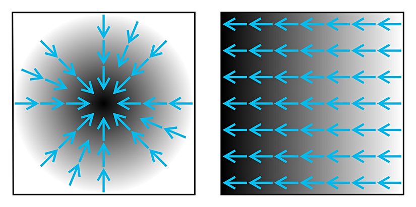 ∇\nabla operatörünün yaptığı şey ise, işte skaler olan bir alanın, en hızlı/sert değiştiği yeri hesaplamaktır. (Navier-Stokes Denklemleri'nde karşımıza çıkan vektörel alanlarda da bazen bu anlamda kullanılabilir; ama bunu şimdilik görmezden gelebilirsiniz.) Basitçe hatırlamanız gereken, eğer işlem yaptığınız sistem skalerse, ∇\nabla operatörünün o alanın en hızlı veya sert şekilde değiştiği noktanın hesaplanmasında kullanıldığıdır.