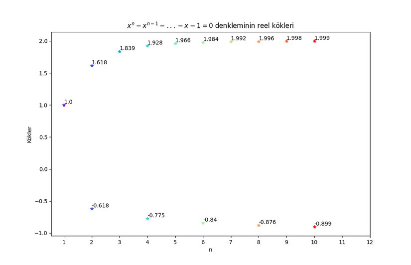 PythonBu çözüm üzerinde şöyle bir gözlem yapmak mümkündür: NN tek sayı iken reel kök sayısı 1, çift iken reel kök sayısı 2'dir. Ayrıca görebileceğiniz (ve bekleyeceğiniz) üzere 2−2-Bonacci dizisi bildiğimiz Fibonacci dizisi ile, 3−3-Bonacci dizisi ise Tribonacci dizisi aynıdır. Bunlara ilave olarak F1=1, Fn=Fn−1,n≥2F_1=1,\ F_n=F_{n-1}, n\geq 2 ile bir 1−1-Bonacci dizisi de tanımlamış olduk, bu dizi de aslında 1,1,1,1,1,...1,1,1,1,1,... dizisidir.