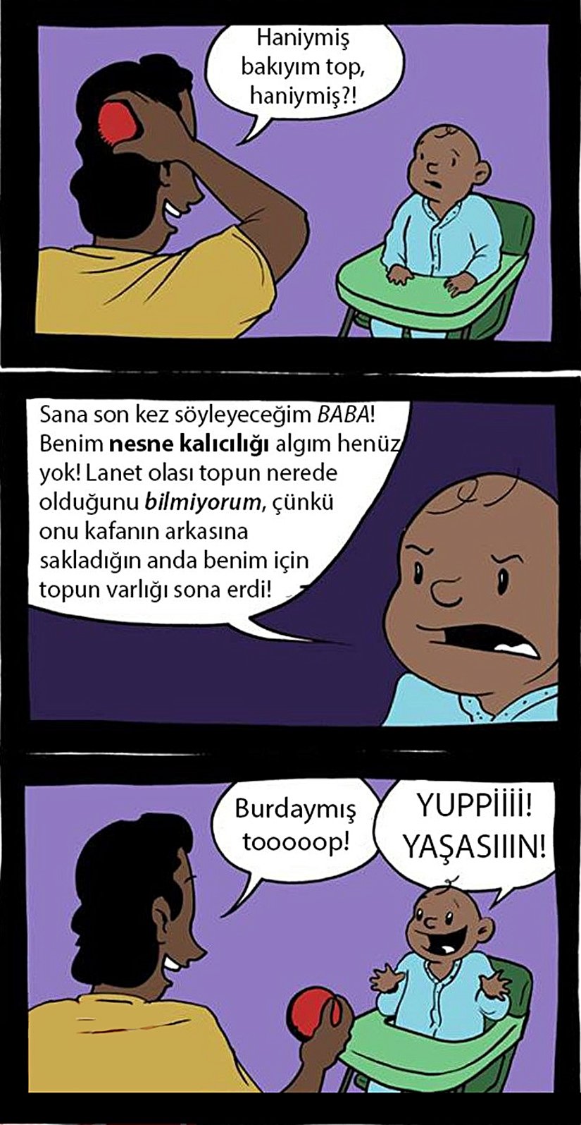 SMBC Comicsİşte tam olarak bu nedenle "Ce eee!" oyunu (yüzü ellerle kapatıp birden açma şeklinde oynanan oyun) onları güldürür, heyecanlandırır, şaşırtır. Çünkü yüzünüzü görmediklerinde, yüzünüzün yok olduğunu varsayarlar. Daha doğrusu, ellerinizi açtığınız zaman yüzünüz onlar için "yoktan belirivermiş" olur ve tanıdıkları bir yüzü görmek onları mutlu eder.