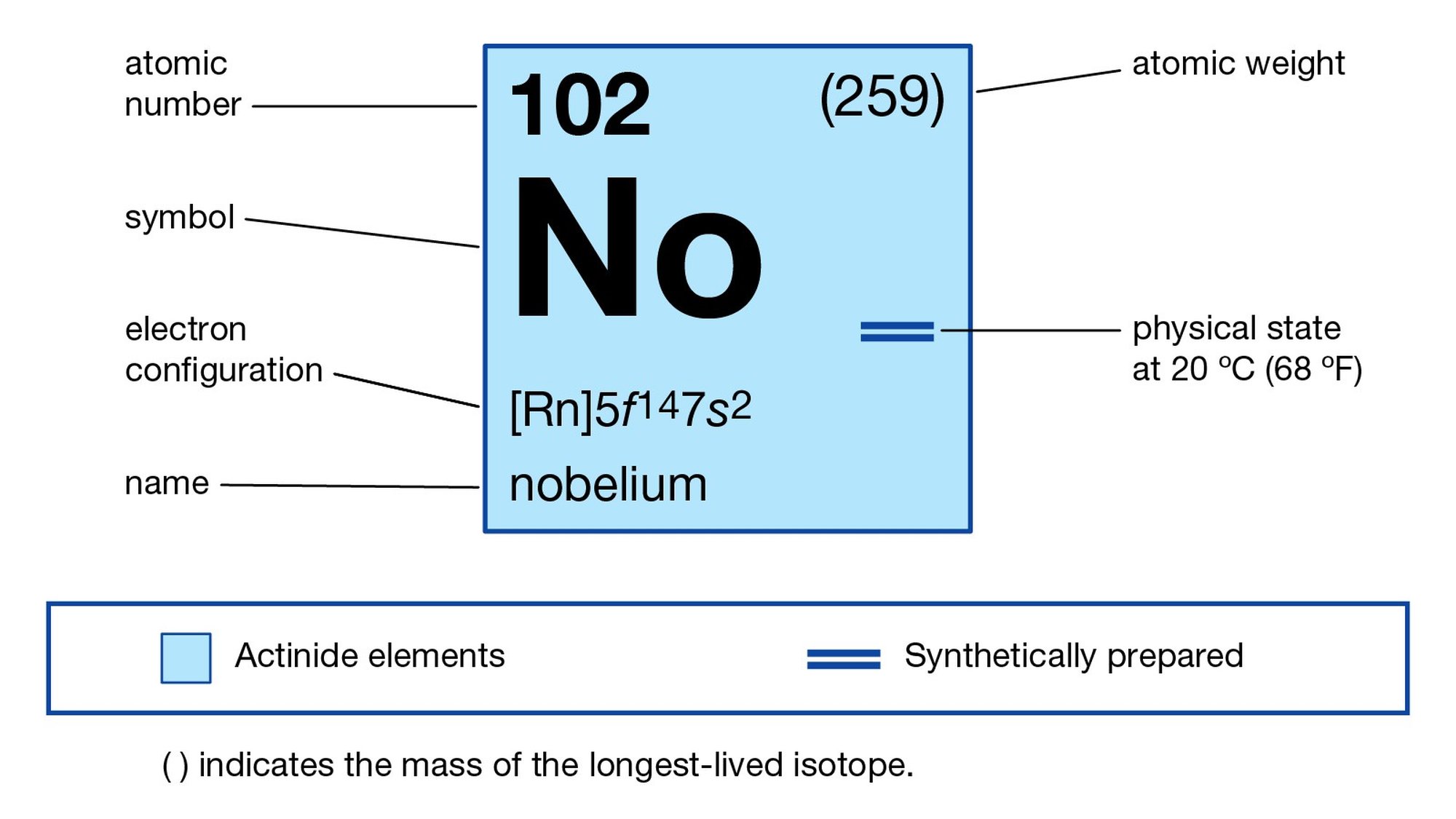 - Nobelyum, atom numarası 102 olan radyoaktif ve sentetik bir elementtir; sadece parçacık hızlandırıcılarla üretilebilir ve toplu miktarlarda sentezlenmesi mümkün değildir.