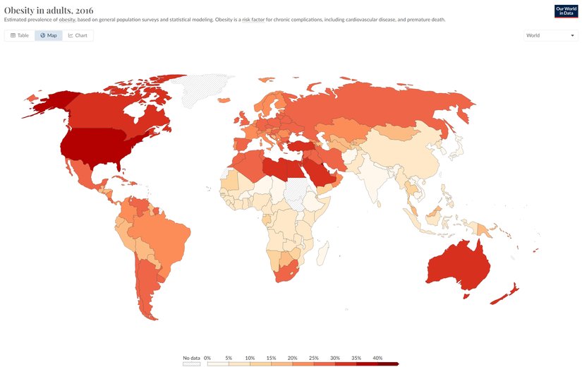 Obezite, yetişkinlerde ve çocuklarda artan oranlarla dünya çapında önde gelen önlenebilir bir ölüm nedenidir.[45] 2022'de dünya çapında 1 milyardan fazla insan obezdi (879 milyon yetişkin ve 159 milyon çocuk) ve bu 1990'da kaydedilen yetişkin vakalarının iki katından fazlasını (ve çocuklar arasındaki vakalardan dört kat daha yüksek) temsil ediyordu.[46] Obezite kadınlarda erkeklerden daha yaygındır.[47] Günümüzde obezite dünyanın çoğunda aşağılanmakta ve küçümsenmektedir. Buna karşılık, geçmişte ve günümüzde bazı kültürler obeziteyi zenginlik ve doğurganlığın bir sembolü olarak görerek olumlu bir bakış açısına sahiptir.[48]