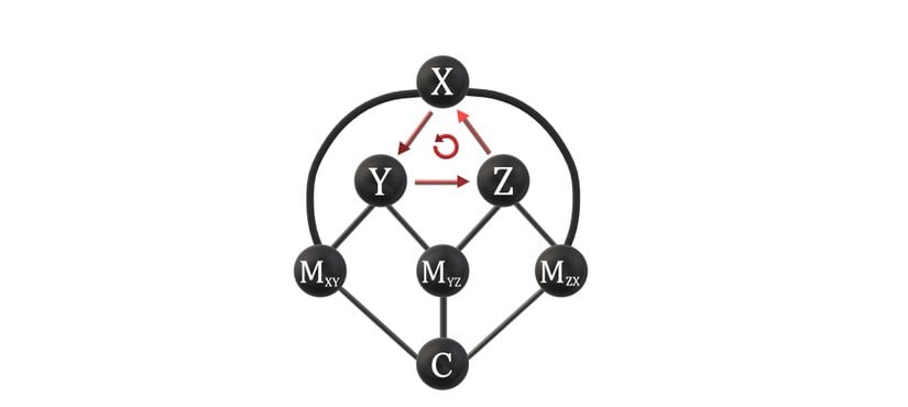 Genişletilmiş Öncelik Grafı, yukarıdaki (3−4−5−3)(3-4-5-3) ilişkisinde olduğu gibi, döngüsel (İng: "cyclic") ilişkiler oluşturabilir. Sadece heterarşiye Genişletilmiş Öncelik Grafı oluşturmak için eklenen yaylardan meydana gelmiş olan bir döngüsel ilişki, aşağıdaki graftaki (X−Y−Z)(X-Y-Z) ilişkisi ile örneklendirilebilir.
