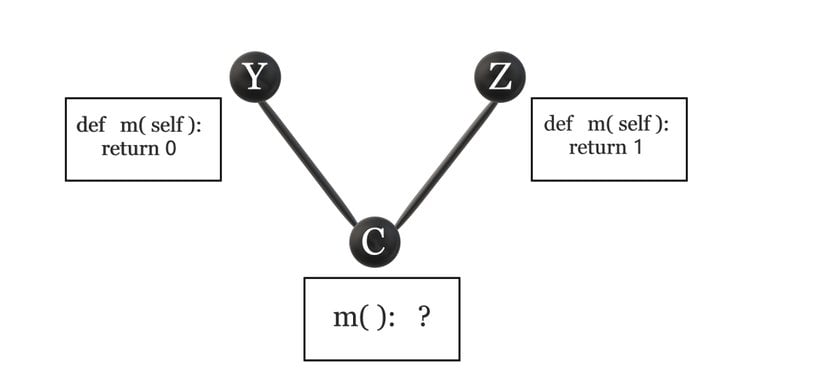Öncelikle, eğer CC klasının kendisi, herhangi bir m()m() metodu içerseydi, ulaşılacak ilk m()m() metodu tabii ki de bu metot olurdu. YY ve ZZ sınıfları arasında yapılacak olan seçim de, CC sınıfının ilanında (İng: "declaration") olduğu gibi, ilk kalıtılan YY sınıfı yönünde olurdu. Sonuç olarak, CC sınıfının herhangi bir objesi m()m() metodunu çağırdığında, ilk bakılacak yer CC sınıfının kendisidir. Eğer metot burada yoksa, sonraki bakılacak yer YY sınıfı, burada da bulunamaz ise en son bakılacak yer de ikinci süpersınıf olan ZZ sınıfıdır. Yani C→Y→ZC \rightarrow Y \rightarrow Z şeklinde bir hiyerarşi vardır.