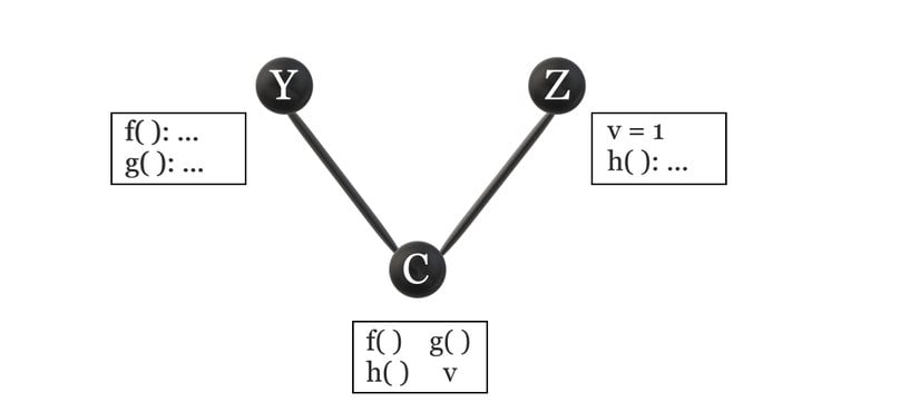 Buradaki öncelik ilişkisi de oldukça yalındır: Bir önceki örnekte de olduğu gibi, CC sınıfı kendisinin direkt süpersınıfı olan YY klasından daha spesifik olduğundan dolayı, CC sınıfı YY'den önce geldiği gibi, YYde ZZ'den daha spesifik olduğu için ZZ'yi önceler. Yani bu durumda C→Y→ZC \rightarrow Y \rightarrow Z hiyerarşisi mevcuttur.