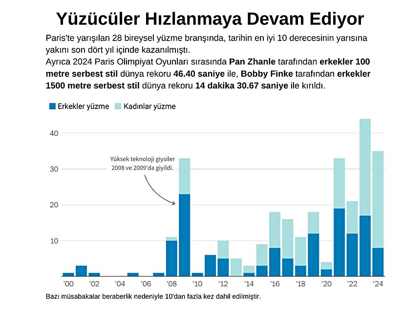 En iyi olimpiyat performansları, yüzmedeki hızlı ilerlemeyi vurguluyor. Bireysel atletizm branşlarında 2021 Tokyo Olimpiyat Oyunları şampiyonlarının hiçbiri 1972 olimpiyat şampiyonlarından yüzde 6'dan daha hızlı bir dereceyle şampiyonluk elde etmedi. Bunun yanında Tokyo'da bireysel yüzme branşlarında altın madalya kazananların her biri 1972 olimpiyat şampiyonlarından en az yüzde 7 daha hızlı bir derece elde etti. 10 branşta ise en az yüzde 10 daha hızlıydılar.