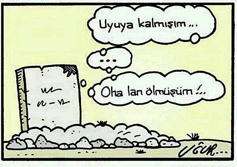 Bu bakımdan ölümü, uzatılmış ve geri dönülmez uyku hali olarak tanımlamak mümkündür. Bu tanım tamamen bilimsel değildir; çünkü uyku halinde beynimiz halen aktiftir; hatta kimi zaman uyanık olduğumuzdan bile daha aktif olabilmektedir. Ölümde ise beyin tamamen aktivitesini yitirmiş olacaktır. Ancak uyku sırasında da bilince giden sinir yolakları susturulduğu için, geçici bir ölüm hali simüle edilmektedir diyebiliriz. Aşağıdaki karikatür bunu enfes bir şekilde özetlemektedir: