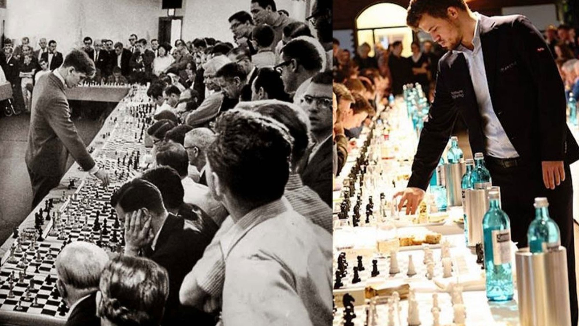 İlk fotoğrafta, ünlü satranç ustası Bobby Fischer, 1964 yılında 50 rakibe karşı birden satranç oynarken görülüyor. İkinci fotoğrafta ise şu anda Dünya Satranç Şampiyonu olan Magnus Carlsen, 70 farklı rakibe karşı aynı anda satranç oynarken görülüyor. Carlsen, aynı anda oynadığı bu maçların 68'ini kazandı, 2'sini kaybetti.
