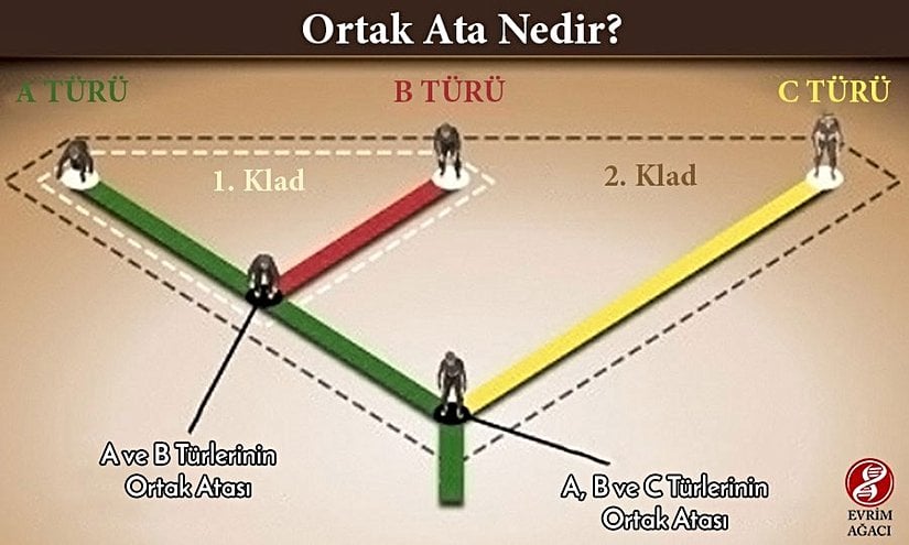 Görselde dikkat edilmesi gereken en önemli nokta, A ve C türlerinin ortak atasının, aynı zamanda B ve C'nin de ortak atası olmasıdır. Yani zamanda geriye gittikçe ulaştığımız ortak atalar, giderek artan sayıda modern canlı türünün atasıdırlar. Tıpkı soy hattımızda geriye gittikçe ulaştığımız dedelerimizin ve dedelerimizin dedelerinin ve onların dedelerinin giderek artan sayıda toruna sahip olmak zorunda olmaları gibi...