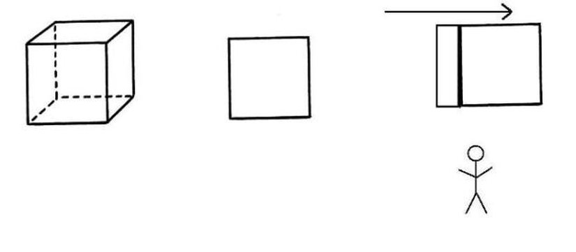 1 saniye sonra araba sizin hizanızda olsun. Tabii ki siz bunu daha bilemezsiniz, çünkü henüz arabadan çıkan fotonlar gözünüze ulaşmadı. Eğer ki araba ışık hızına yakın bir şekilde hareket etmeseydi de, duruyor olsaydı, gerçek hayatta gördüğümüz gibi arabanın bize dönük olan yanını tam olarak görecektik. Ancak araba aşırı hızlı gidiyor olduğundan, yandan gelen fotonların yol arkadaşları vardır: arka tampona çarpan o tek foton, son saniyeyi arabanın genişliği boyunca ilerlemek için kullanmıştır. Dolayısıyla tüm fotonlar gözünüze ulaştığında, normal şekilde arabanın yan tarafını görmekle kalmaz, aynı zamanda arka tampondan gelen tüm fotonları da görürsünüz. Yani arabanın hem yanını, hem de arkasını aynı anda görebilirsiniz.