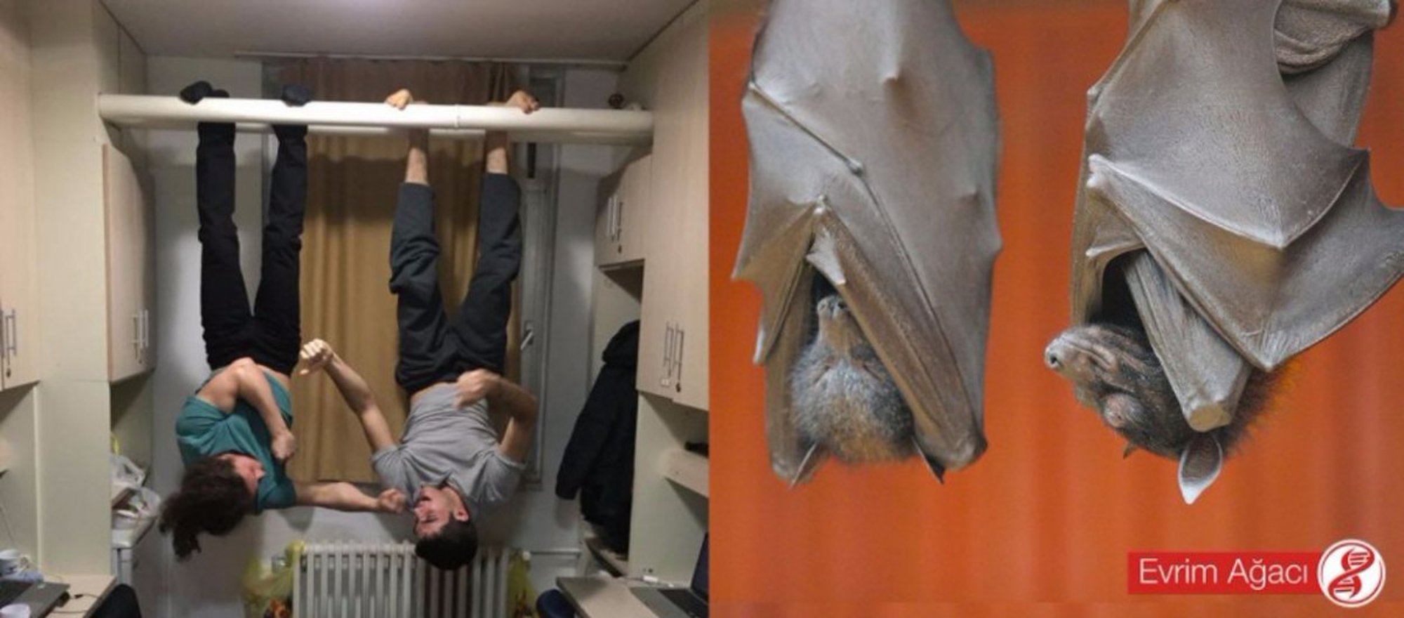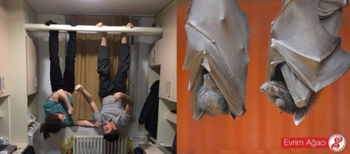 İki ODTÜ öğrencisinin evlerinde verdikleri bu komik ve tuhaf poz, bizi düşünmeye itti. Gerçekten de kuzenlerimizden o kadar da farklı değiliz. Elbette iddiamız, insanların içgüdüsel olarak yarasalarla bir benzerlik taşıdıkları değil. Ancak anlamamız gereken bir gerçek var ki, insanlar sadece şempanzelerle akraba değiller. Bir çam ağacıyla da, sizi hasta eden bir bakteriyle de, yumurtasını yediğiniz tavukla da, onun atası olan dinozorlarla da, içinde yüzdüğünüz sudaki balıklarla da, onların yemi olan ufak kabuklularla da akrabasınız, akrabayız!