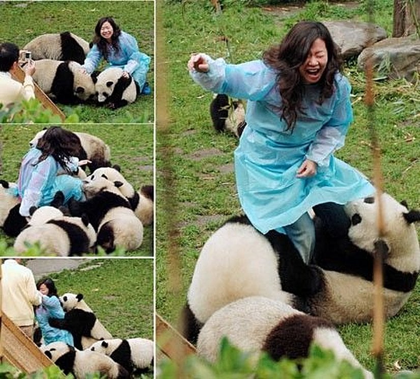 Bunun bir örneğini Beijing Hayvanat Bahçesi'nde bulunan Gu Gu isimli pandadan görebiliriz. Gu Gu'nun saldırdığı, her seferinde bölgesine izinsiz ve deneyimsiz olarak giren 3 ayrı ziyaretçi, vücutlarında ölümcül yaralarla hastaneye kaldırıldı. İlk saldırıda bahçenin görevlilerinden Zhang Xinyan isimli şahıs pandaya sarılmaya çalışırken pandanın güçlü saldırısı sonucu 2 bacağından da derin yaralar aldı. İkinci saldırıda 15 yaşındaki Li Xitao yine iki bacağından da ısırıldı. Gu gu, çocuğun her iki bacağından da büyük et parçaları kopardı, iki bacağındaki kemikler de kırıldı. Üçüncü saldırıda ise Zhang Jiao isimli ziyaretçi yine bacaklarından ısırıldı, temel bağ dokusu parçalandı. Görevliler dakikalarca Gu gu'nun çenesini şahsın bacağından ayıramadılar.