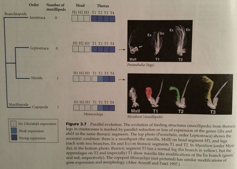 - Michael Averoff ve Nipam Patel'in araştırmaları, ortak genlerin (Ubx ve abdA) paralel işlev kaybının, bacakların ağız aparatına evrimleşmesini sağladığını göstermektedir.