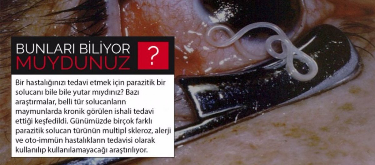 Bir hastalığınızı tedavi etmek için parazitik bir solucanı bile bile yutar mıydınız? Geçtiğimiz yıl yapılan bir çalışmada belli tür solucanların maymunlarda kronik görülen ishali tedavi ettiği keşfedildi. Günümüzde birçok farklı parazitik solucan türünün multipl skleroz, alerji ve oto-immün hastalıkların tedavisi olarak kullanılıp kullanılamayacağı araştırılıyor.