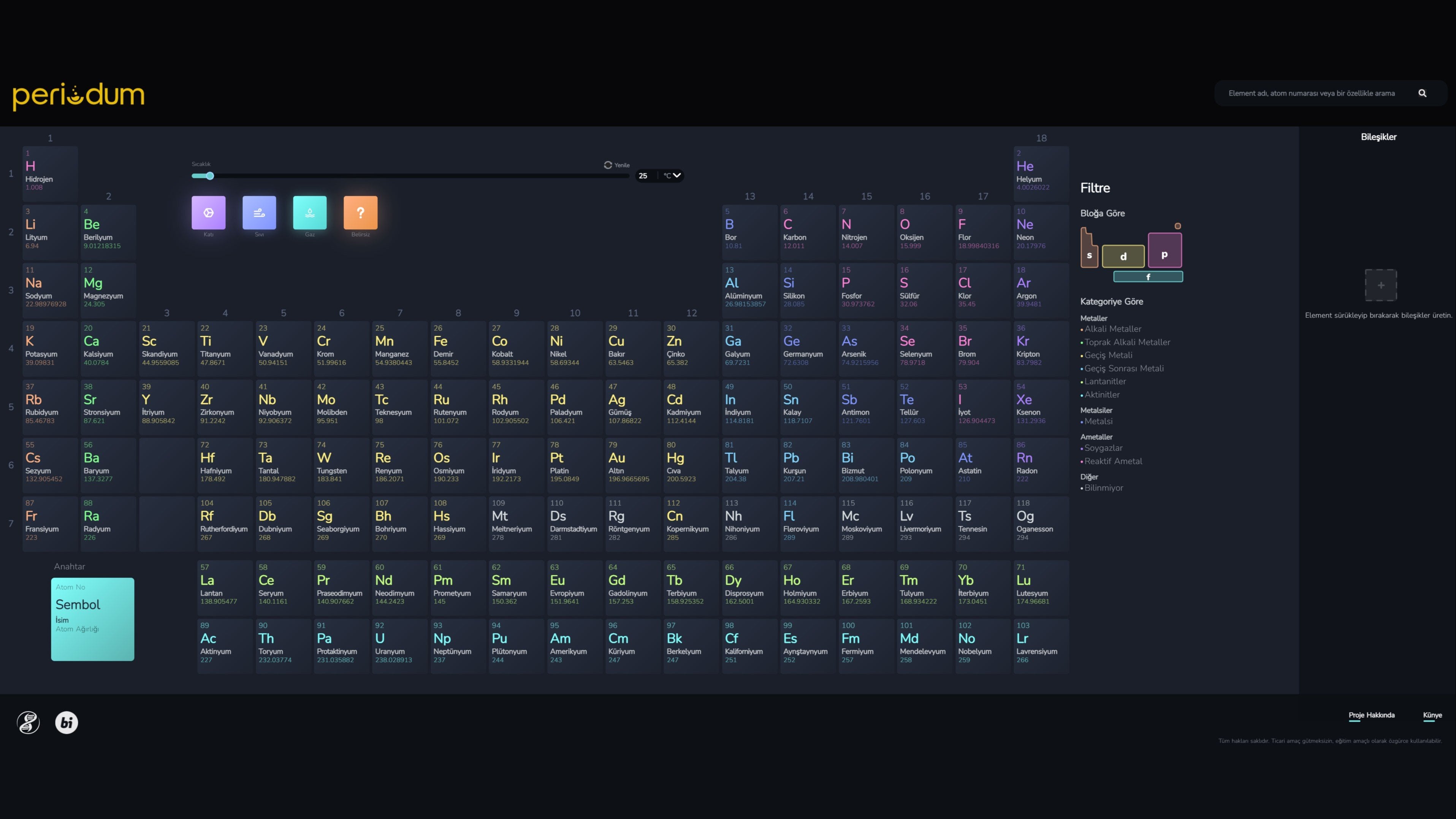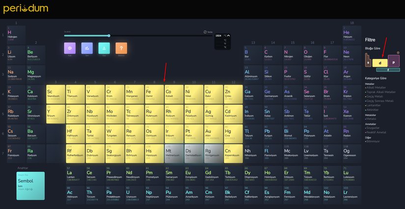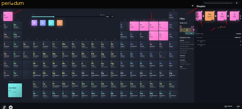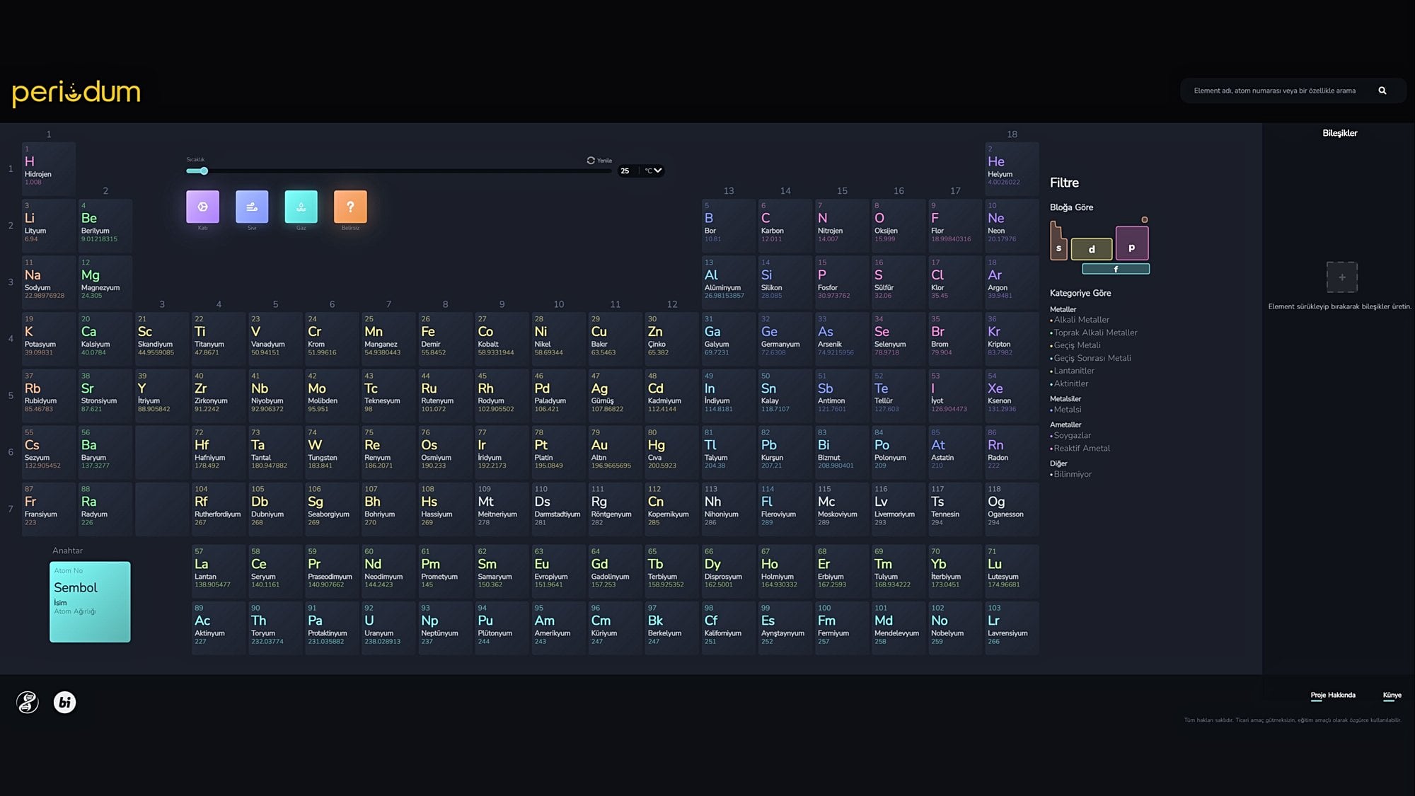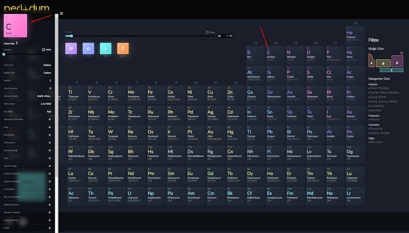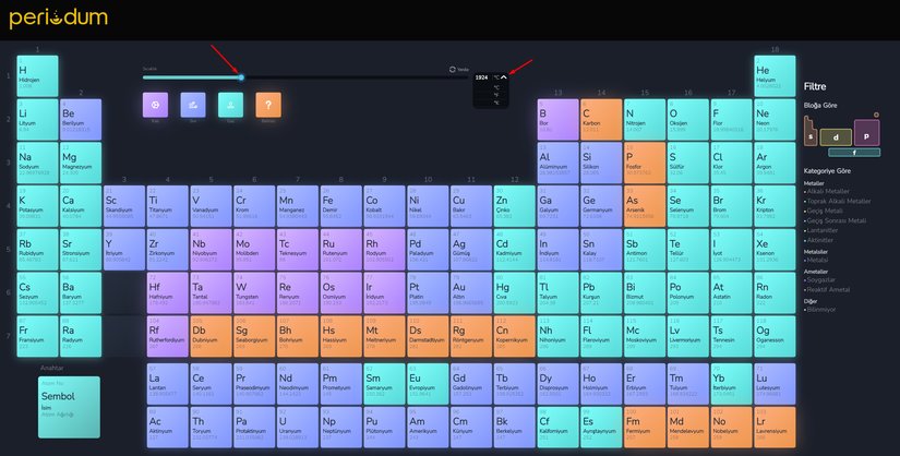 Periodum sayesinde elementleri belirli özelliklerine göre filtreleyip gösterebilirsiniz. Bunun için periyodik tablonun sağ tarafındaki Filtre kısmını kullanabilirsiniz: