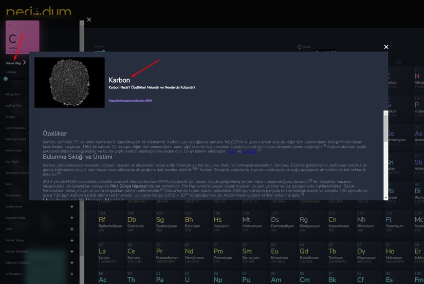 Periyodik tablo üzerindeki herhangi bir elemente tıkladığınızda, sol taraftan bir menünün açıldığını göreceksiniz. Bu menü, element hakkında çok kapsamlı bilgiler alabileceğiniz bir paneldir: