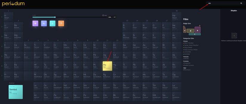 Periodum kullanarak, arama çubuğuna element isimlerini veya atom numarasını yazarak periyodik tablo üzerinde o elementi hızlıca bulabilirsiniz.