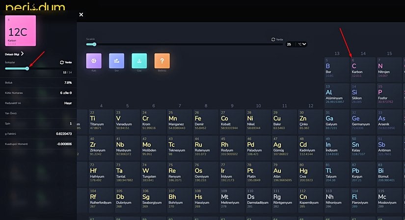 Periodum sadece elementler için değil, aynı zamanda o elementlerin izotopları hakkında da bilgi alabileceğiniz bir periyodik tablo! Bunun için tek yapmanız gereken, herhangi bir elementi seçtikten sonra İzotoplar çubuğunu sağa-sola kaydırmak. Bu çubuk, elementin izotopları arasında geçiş yapmanızı sağlar.