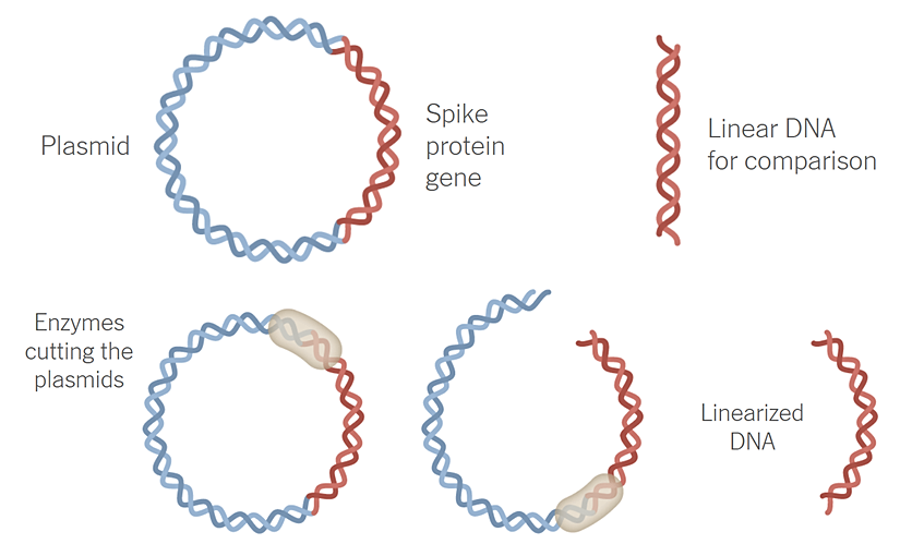 The New York TimesNihayet bu işlem de tamamlandığında, elde edilen plazmidlerin, koronavirüs genleri ile karşılaştırılarak, herhangi bir değişime uğramadığına emin olunması gerekmektedir. Eğer plazmidler bu testi başarıyla geçerlerse, bu karışıma enzimler ilave edilir. Bu enzimlerin karışım içindeki görevi, halkasal plazmiddeki koronavirüs genlerini plazmidden ayırmak olacaktır. Bu sürece linearizasyon adı verilir ve ortalama 2 gün sürer.