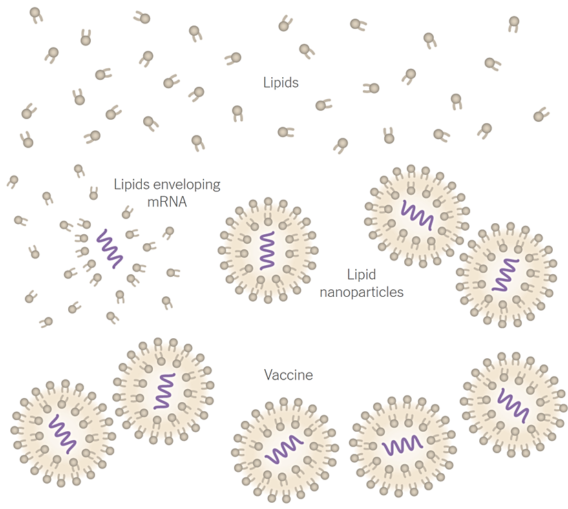 Öte yandan bilim insanları, bu sırada mRNA moleküllerini koruması için yağ yapıda (lipit) moleküller hazırlamakla uğraşırlar. Gerekli miktarda lipit ölçülür ve etanol ile karıştırılarak steril edilir. Etanol, süreç sonunda karışımdan uzaklaştırılır. Bir araya konulduklarında lipit molekülleri, mRNA parçacıklarını çevreleyerek lipit nanopartikülleri denilen yapıyı oluştururlar. Lipitleri ve mRNA moleküllerini bir araya getiren ve bir arada tutan şey, elbette elektrik yüküdür. mRNA molekülünü birkaç katman lipit çevreler ve bu yapı, aşının son halini oluşturur.
